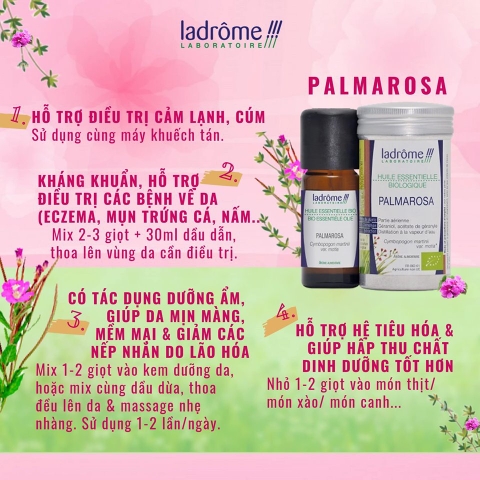 - HỖ TRỢ ĐIỀU TRỊ CẢM LẠNH & CÚM: Nếu bạn đã biết sả có tác dụng chữa cảm cúm thì đây là lúc bạn nên thử thêm “thần dược” mới là Palmarosa nhé. Hương thơm dịu nhẹ của Palmarosa vừa giúp bạn giải cảm vừa khiến bạn thư giãn nữa đấy. Chỉ cần khuếch tán, thế là một công đôi chuyện rồi!