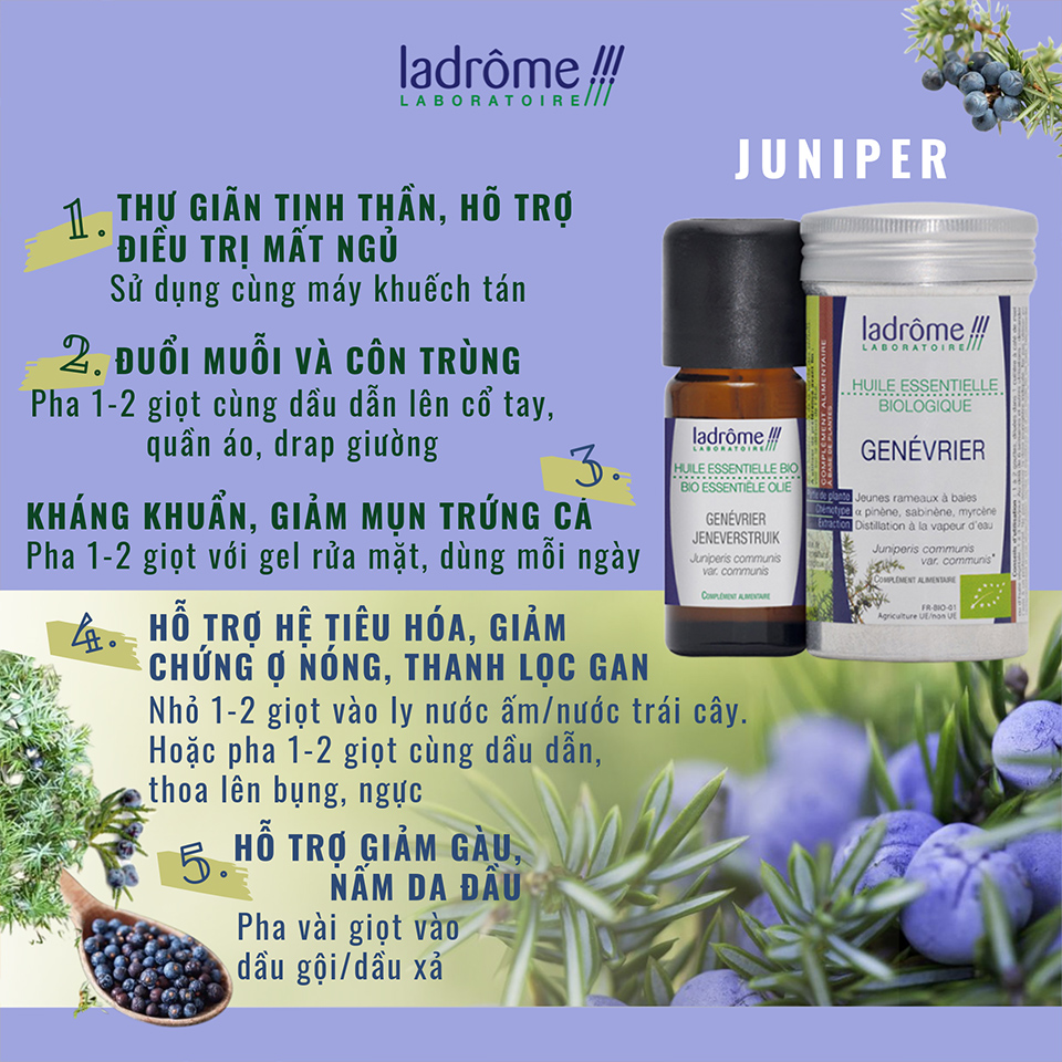 - Với khả năng kháng khuẩn tự nhiên, Juniper hỗ trợ làm dịu làn da bị ngứa, đỏ, dị ứng và làm lành bề mặt các nốt mụn trên da.